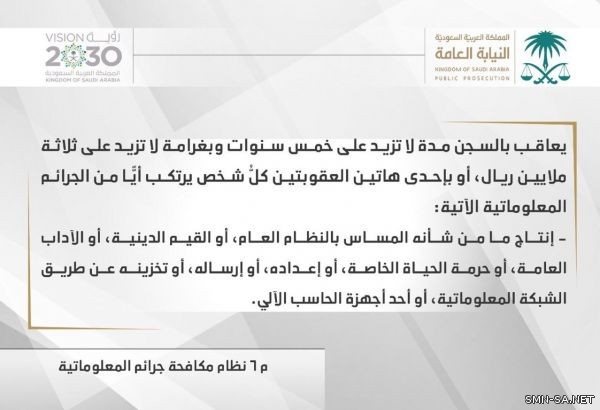 إنتاج الشائعات أو الأخبار الزائفة التي من شأنها المساس بالنظام أو الأمن العام أو إرسالها أو إعادة إرسالها عبر وسائل التواصل الاجتماعي أو أي وسيلة تقنية يُعد جريمة_معلوماتية تصل عقوبتها للسجن خمس سنوات، وغرامة ثلاثة ملايين ريال.
