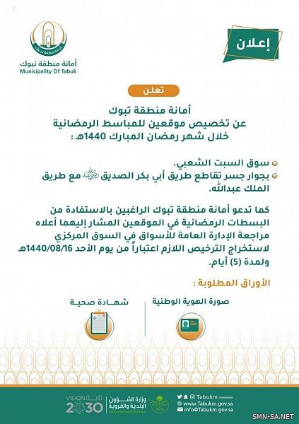 وأوضح المتحدث الرسمي لأمانة منطقة تبوك المهندس إبراهيم بن أحمد الغبان, أنه يمكن للراغبين بالاستفادة من البسطات الرمضانية في الموقعين المشار إليهما مراجعة الإدارة العامة للأسواق في السوق المركزي لإستخراج التراخيص اللازمة وذلك اعتباراً من اليوم ولمدة (5) أيام , على أن يتم إحضار صورة من الهوية الوطنية إضافة إلى ضرورة وجود شهادة صحية لصاحب الطلب.