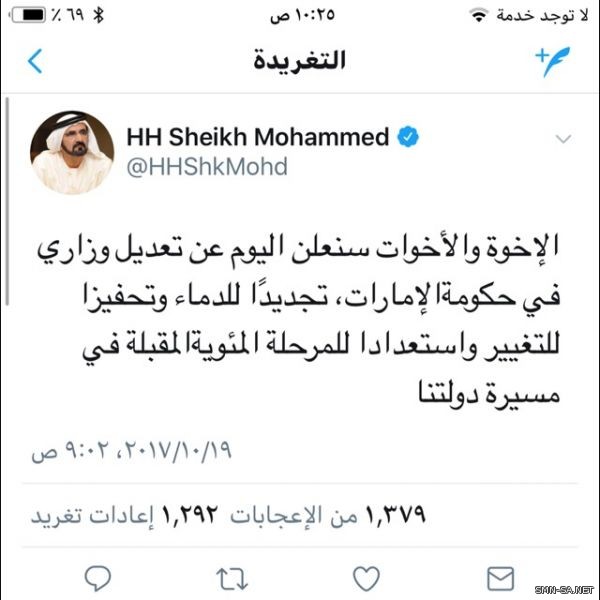 الشبكة الإعلامية السعودية-متابعات أكد صاحب السمو الشيخ محمد بن راشد آل مكتوم، نائب رئيس دولة الإمارات، رئيس مجلس الوزراء، وحاكم إمارة دبي، عن تعديل وزاري مرتقب في حكومة الإمارات.